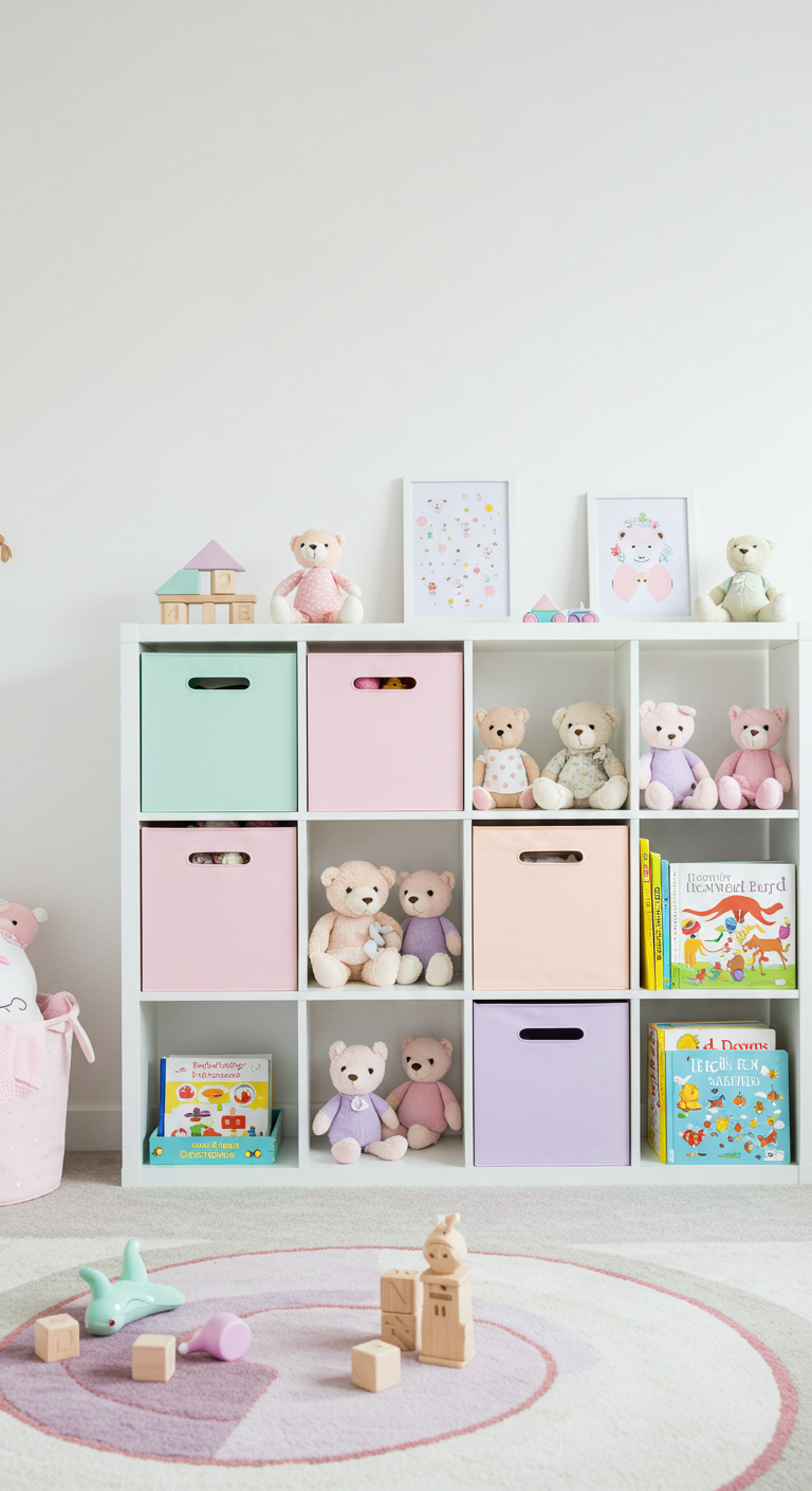 Organisez le rangement avec des cubes de couleurs pastel différentes : menthe, rose, pêche, lavande. Ces modules créent un rangement ludique et coloré tout en permettant à bébé d’apprendre les couleurs en grandissant.
