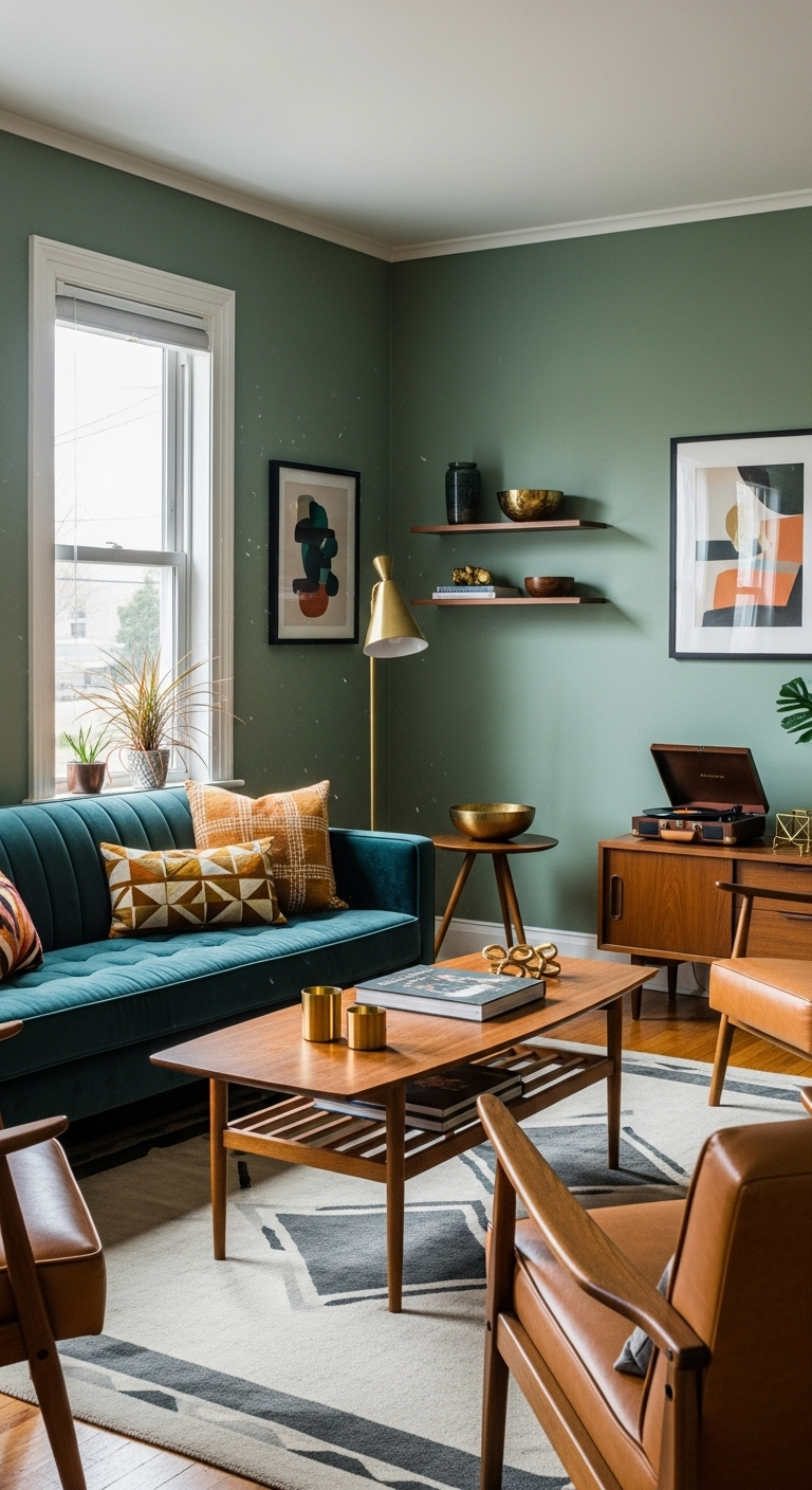 Transformez instantanément votre salon en créant un magnifique mur d’accent en vert sauge ! Cette technique déco permet de structurer l’espace sans alourdir la pièce. Le vert sauge vintage s’associe parfaitement avec des meubles en bois clair ou foncé, des textiles beiges et crème, et des accessoires en laiton doré.