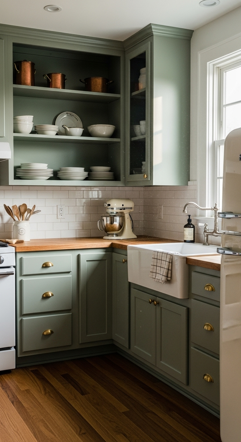 Osez la cuisine vintage complète avec des armoires en vert sauge ! Cette teinte apporte une fraîcheur extraordinaire à la pièce la plus fréquentée de la maison. Associez vos armoires vert sauge à un plan de travail en bois naturel ou en marbre blanc pour un contraste élégant.