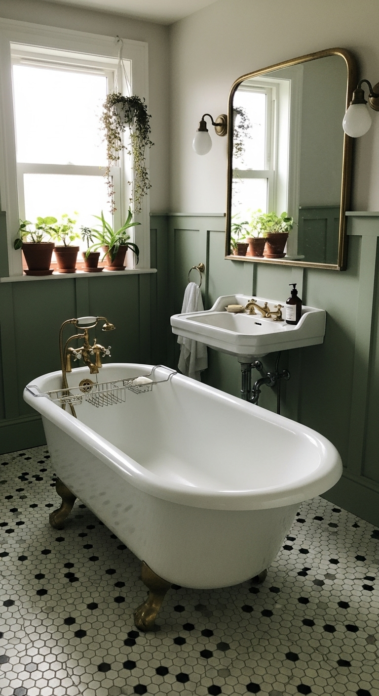 Transformez votre salle de bain en spa vintage avec du vert sauge ! Cette couleur est idéale pour créer une ambiance spa-like et relaxante. Utilisez le vert sauge sur la moitié inférieure des murs, avec un lambris blanc en partie haute pour un look cottage chic authentique.
