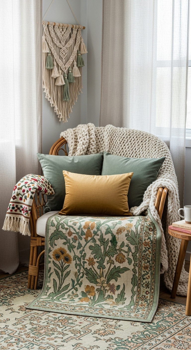 Optez pour des rideaux en lin vert sauge qui filtrent doucement la lumière naturelle. Multipliez les coussins de différentes textures : velours côtelé, lin lavé, coton tissé, pour créer des layers confortables sur votre canapé. Un grand plaid tricoté en vert sauge sur le fauteuil favori devient immédiatement une invitation au cocooning. N’oubliez pas le tapis : un kilim vintage aux motifs géométriques intégrant du vert sauge ancre visuellement l’espace. Ces textiles apportent chaleur, confort et style vintage sans effort !