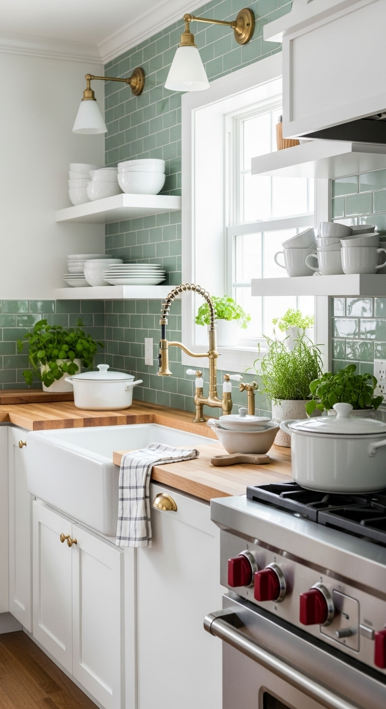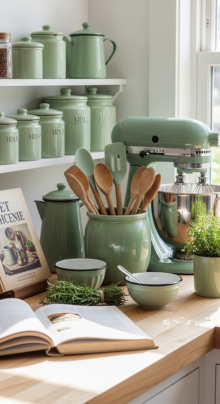 Les petits accessoires font toute la différence ! Intégrez le vert sauge progressivement avec des objets de cuisine vintage : bocaux en céramique, ustensiles, torchons, robot pâtissier rétro, ou batterie de cuisine émaillée.