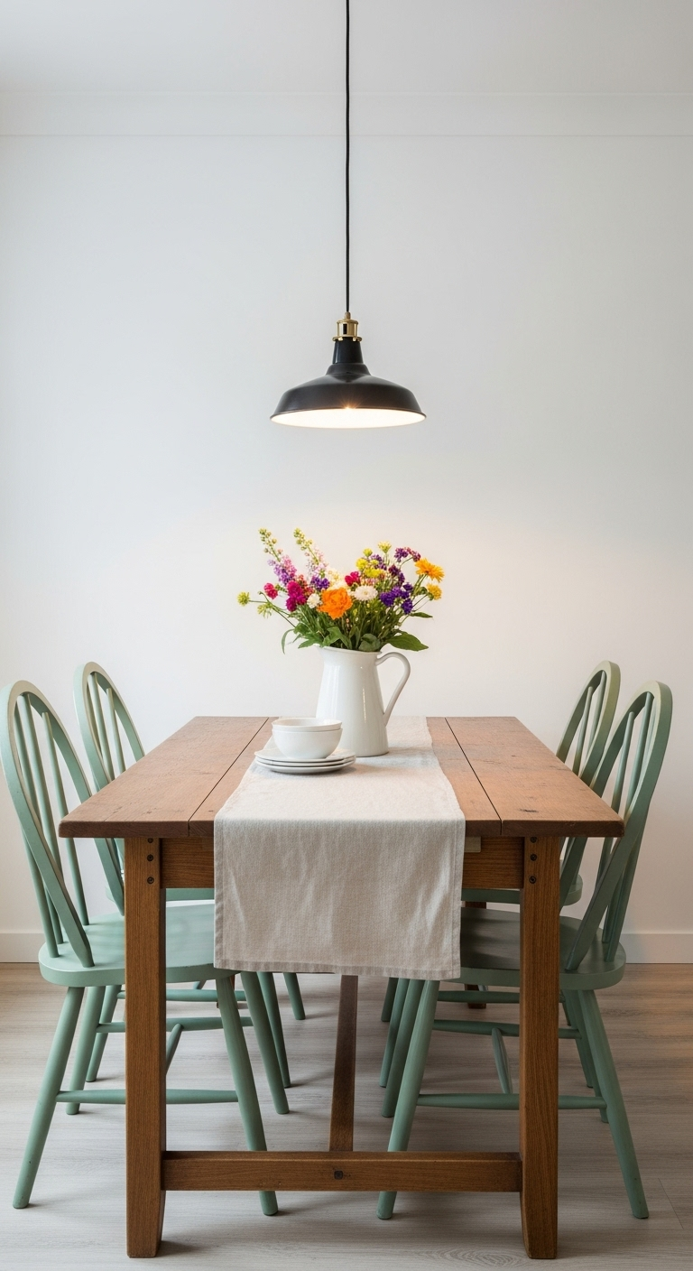 Mélangez les styles pour un look éclectique : des chaises dépareillées toutes peintes en vert sauge créent une harmonie visuelle tout en conservant du caractère. Associez-les à une table en bois massif pour un contraste chaleureux. Suspendez une suspension vintage en laiton ou en rotin au-dessus de la table. Habillez la table avec une nappe ou des sets en lin naturel, des assiettes vintage en céramique et des verres colorés. Un bouquet champêtre dans un pichet ancien complète cette ambiance conviviale. Vos repas de famille n’auront jamais été aussi stylés !