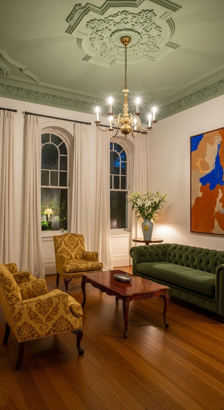 Un plafond vert sauge abaisse visuellement la hauteur de la pièce, créant une atmosphère intimiste et cosy, parfait pour les chambres, bibliothèques ou salons. Cette couleur au plafond attire le regard vers le haut et met en valeur les luminaires vintage : lustres en cristal, suspensions en laiton ou ventilateurs rétro. Conservez les murs dans des tons neutres (blanc, crème, beige) pour équilibrer l’ensemble. Les moulures et corniches peintes en blanc contrastent élégamment. Cette approche architecturale transforme complètement la perception de l’espace et crée un décor vraiment unique et mémorable.