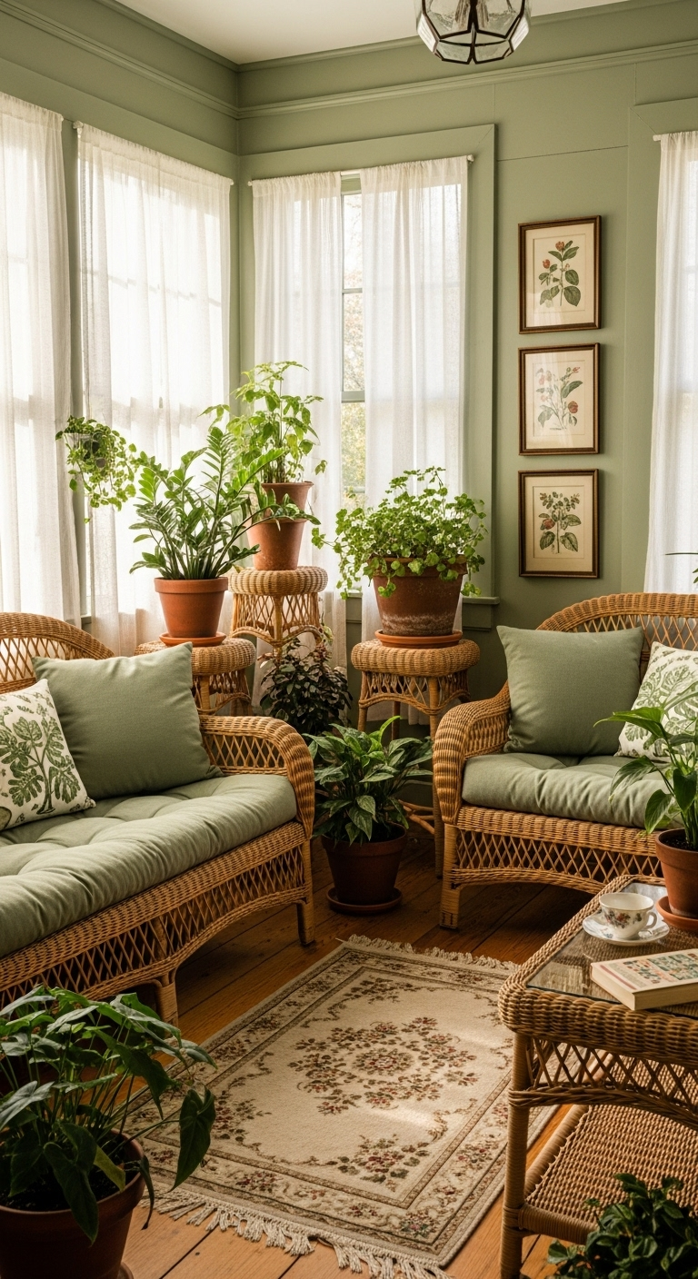 Le vert sauge est la couleur naturelle pour ce type d’espace car elle se fond harmonieusement avec les plantes. Peignez les murs ou boiseries en vert sauge pour créer un écrin végétal. Meublez avec du rotin, de l’osier ou du bambou vintage : fauteuils, méridienne, jardinières sur pied. Les coussins et textiles en vert sauge et blanc apportent confort. Multipliez les plantes de toutes tailles : fougères, pothos, monsteras, cactus en pots vintage en terre cuite ou en céramique. Des estampes botaniques anciennes encadrées renforcent le thème. Ajoutez une petite fontaine, des objets de jardin anciens et des rideaux légers. Cet espace devient votre jungle urbaine privée, parfaite pour se ressourcer !