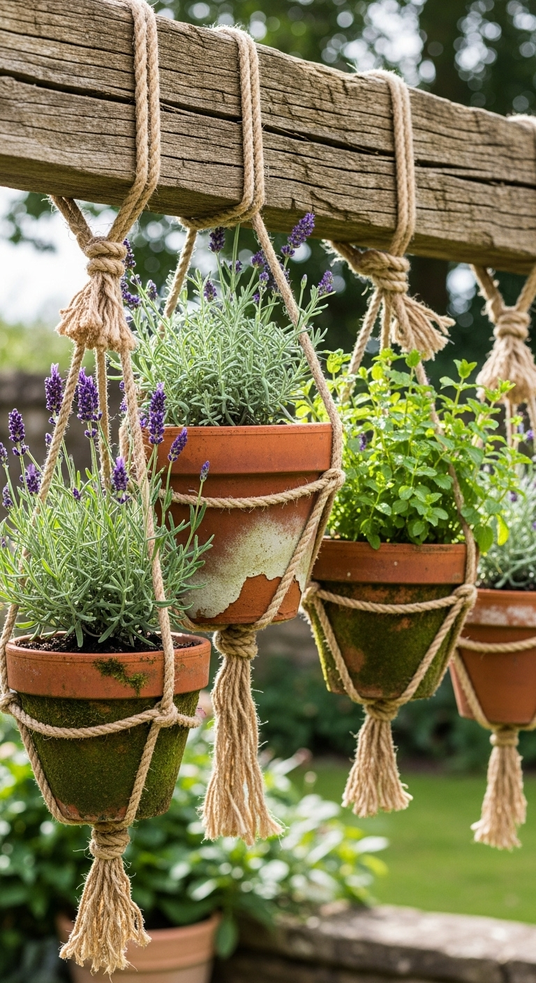 Utilisez des cordes en jute, de la ficelle en chanvre ou même de vieux cordages marins pour suspendre vos pots à différentes hauteurs. Cette variation de niveaux crée un mouvement dynamique et attire naturellement le regard. Les herbes retombantes comme la menthe, le thym citron ou l’origan sont particulièrement adaptées à ce type de présentation.