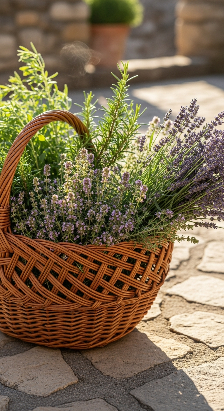 5. Le Panier en Osier Tressé Garni d’Herbes Méditerranéennes