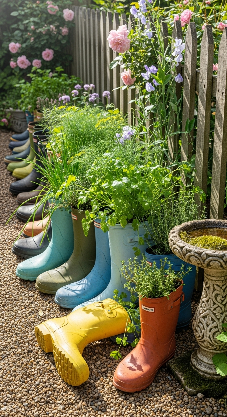 Donnez une seconde vie à de vieilles bottes en caoutchouc en les transformant en jardinières originales et pleines d’humour pour vos herbes aromatiques. Cette idée ludique apporte une touche de fantaisie tout en restant fidèle à l’esthétique rustique et au principe de récupération.