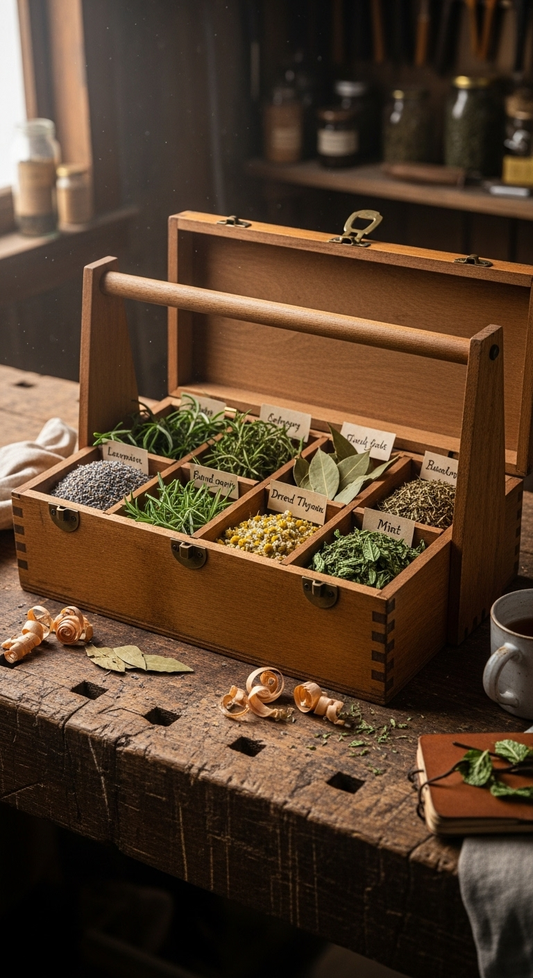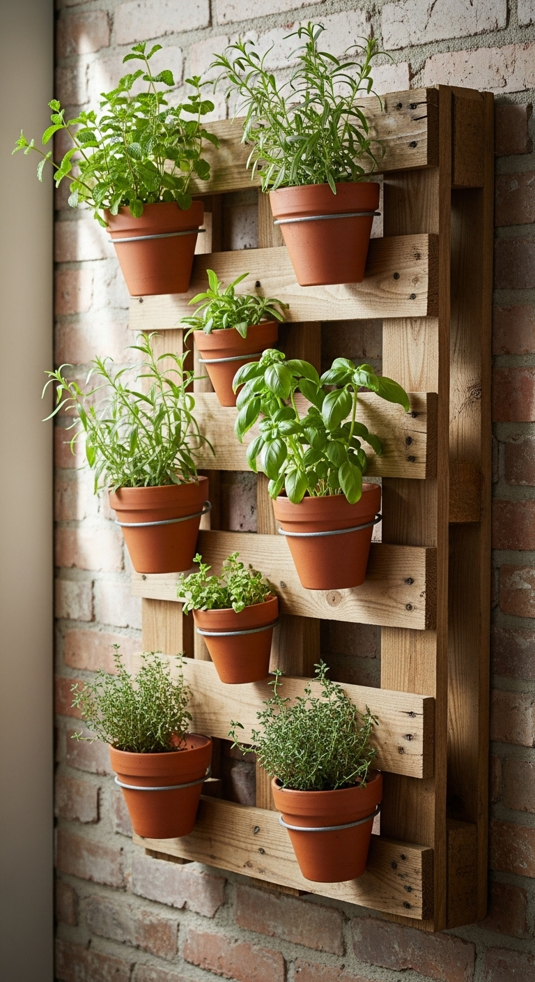 Le contraste entre le bois vieilli et le vert vibrant des herbes fraîches crée un point focal naturellement élégant. Ajoutez de petites étiquettes en ardoise ou en bois gravé pour identifier chaque herbe, renforçant ainsi l’aspect artisanal de votre création.
