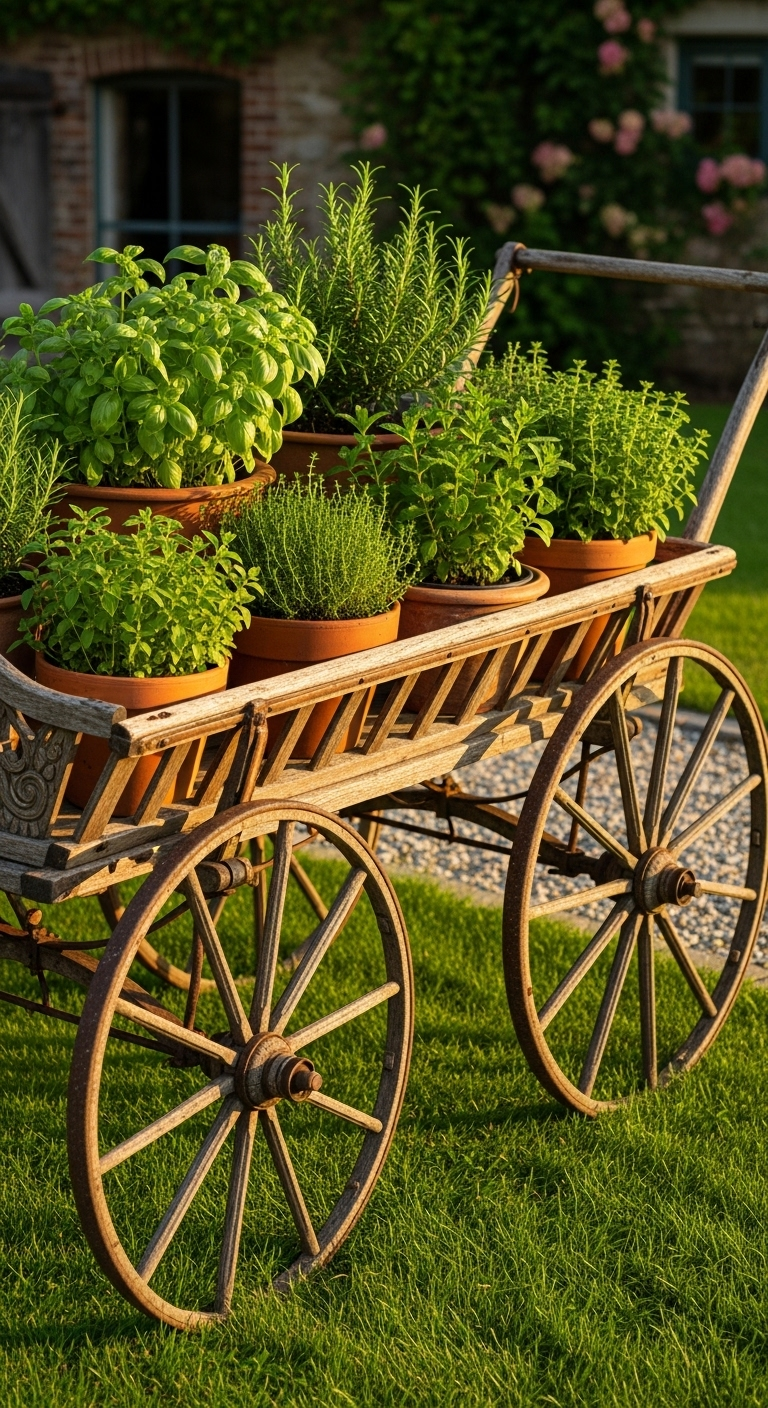 Un vieux chariot de jardin ou une brouette vintage transformé en jardin d’herbes mobile combine fonctionnalité et esthétique rustique de manière remarquable. Cette solution permet de déplacer facilement vos herbes selon l’ensoleillement ou les besoins décoratifs.