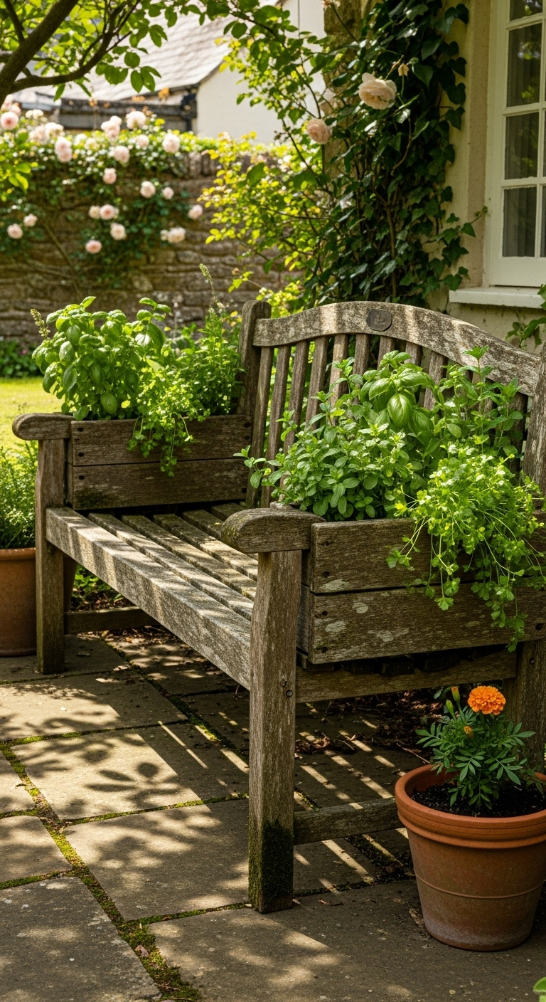 Transformez un vieux banc de jardin en bois en une installation fonctionnelle et décorative en intégrant des jardinières d’herbes aromatiques directement dans sa structure. Cette idée crée un meuble unique qui invite à la fois à la détente et à l’interaction avec vos plantes.