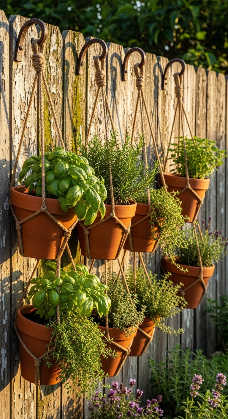 15. Le Mur de Pots Suspendus en Terre Cuite avec Système d’Accroche Rustique