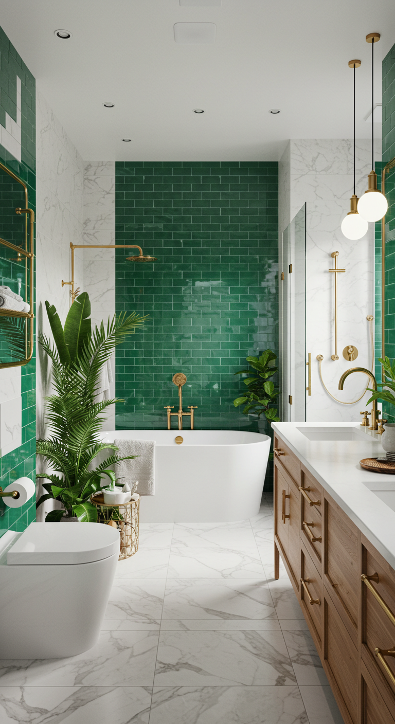 L’émeraude se marie parfaitement avec des touches dorées ou cuivrées pour les robinetteries, créant un contraste luxueux. Complétez ce look avec des accessoires blancs ou crème pour équilibrer l’intensité de la couleur. Cette approche transforme instantanément une salle de bain classique en espace tropical sophistiqué.