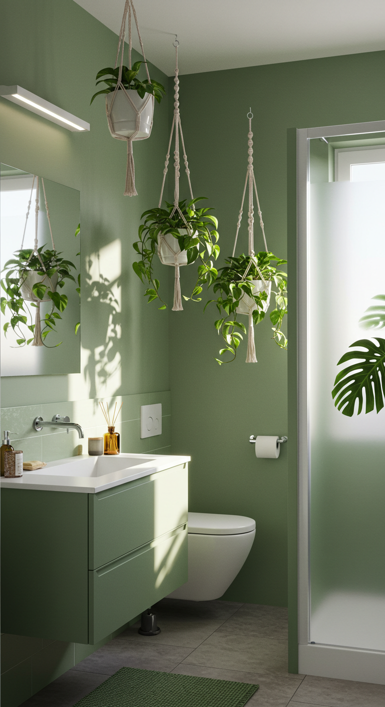 Transformez votre salle de bain en véritable jungle urbaine grâce à une collection de plantes tropicales suspendues. Les pothos, philodendrons et fougères de Boston sont parfaits pour créer cette atmosphère luxuriante. Utilisez des suspensions en macramé naturel ou des cache-pots en céramique verte pour renforcer l’esthétique tropicale.