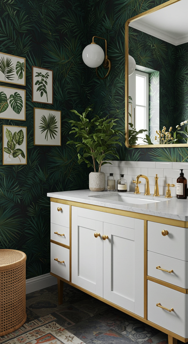 Optez pour un papier peint résistant à l’humidité et appliquez-le sur un seul mur pour éviter la surcharge visuelle. Les motifs oversize créent un effet dramatique, tandis que les patterns plus délicats apportent une touche subtile d’exotisme.