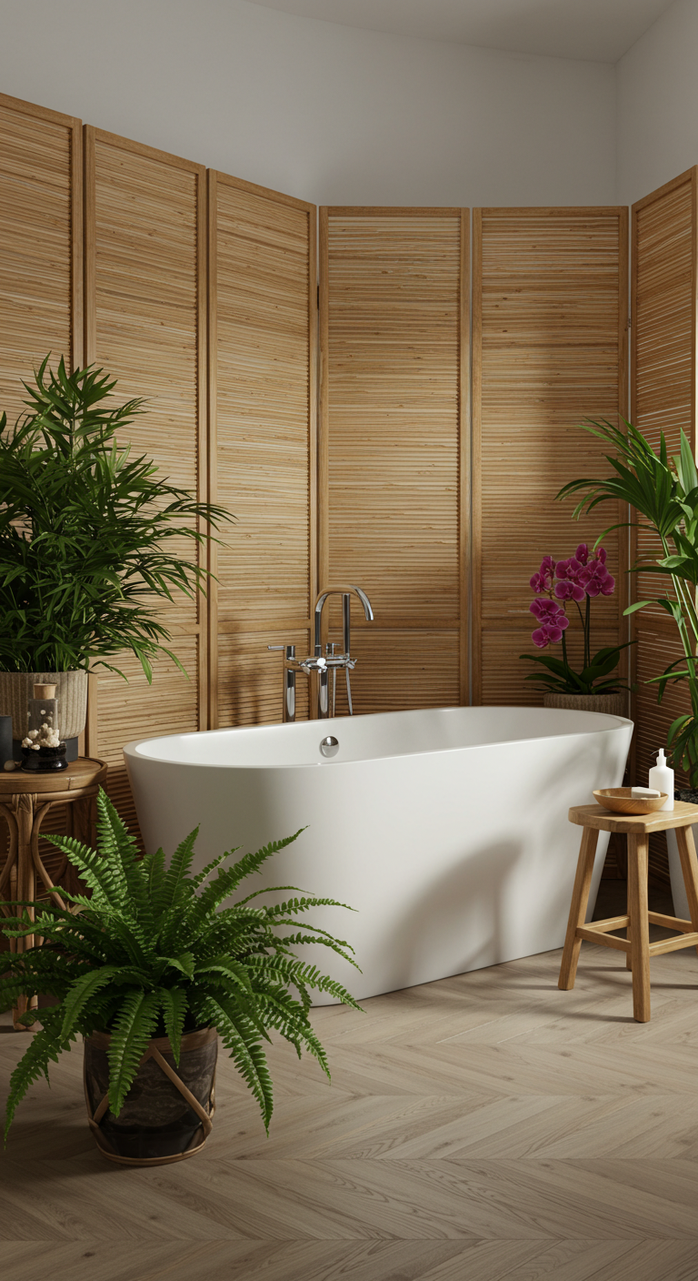 Cette approche crée une intimité naturelle autour de l’espace bain tout en maintenant une circulation fluide. Ajoutez des plantes tropicales autour de la baignoire pour compléter l’effet jungle luxueuse. L’éclairage doux accentue la beauté naturelle du bambou.