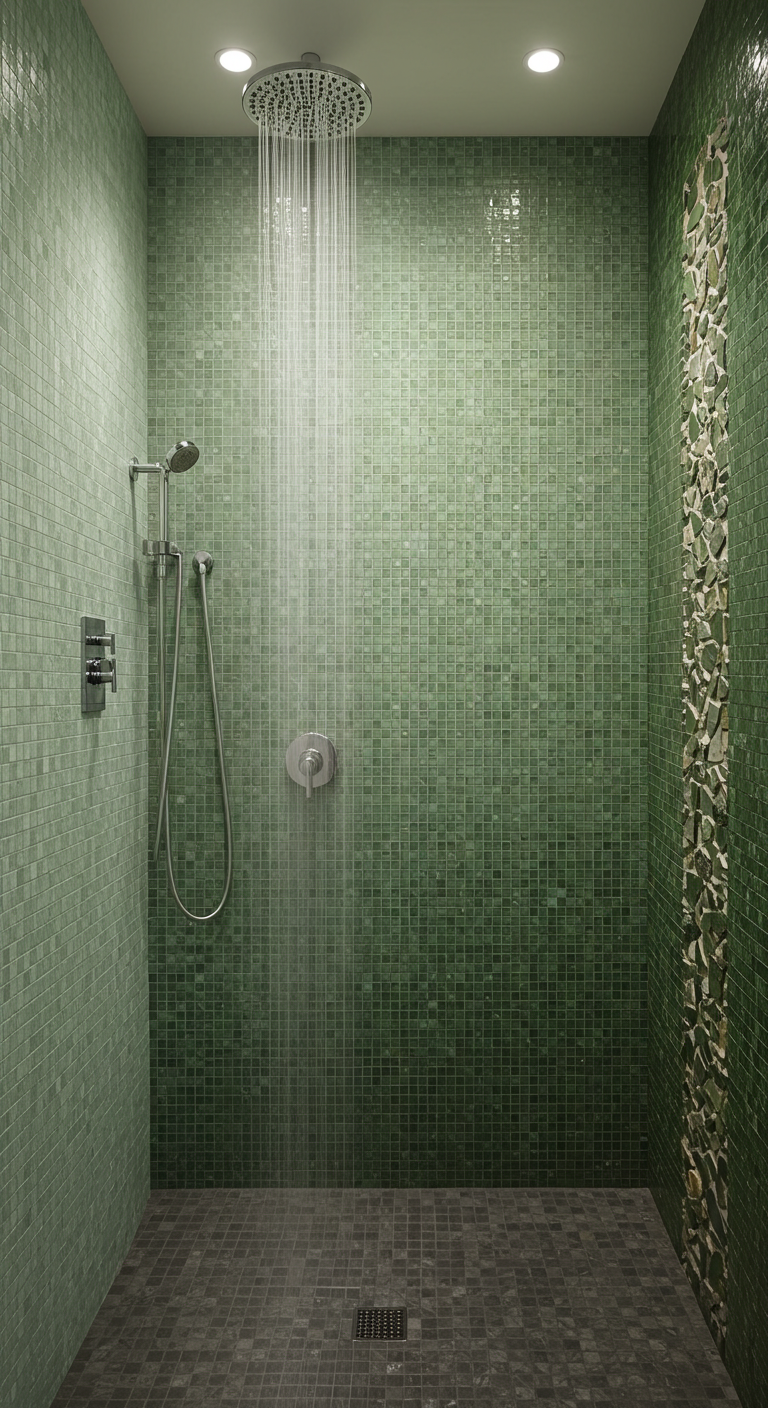 Le carrelage mosaïque en dégradé de vert crée un effet visuel spectaculaire reminiscent des cascades tropicales. Commencez par des tons vert menthe en haut et progressez vers des verts plus profonds en bas. Cette technique apporte profondeur et mouvement à vos murs.