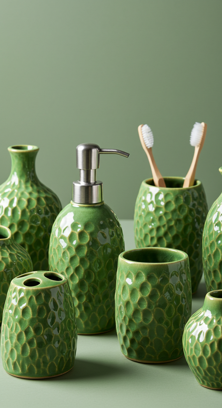 Les accessoires en céramique verte artisanale apportent une touche d’authenticité à votre décoration tropicale. Choisissez des pièces aux finitions variées : brillantes, mates, texturées. Ces éléments créent une cohérence visuelle tout en célébrant l’artisanat local.