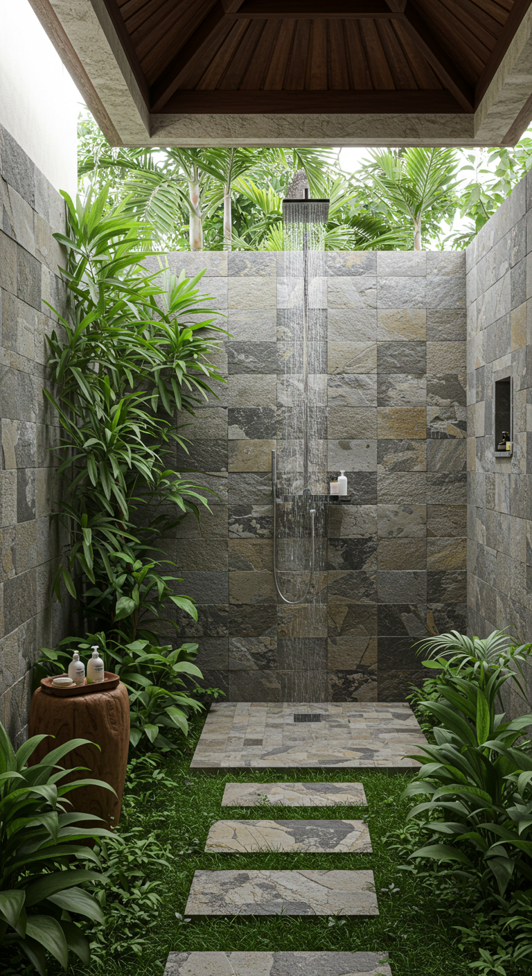 Les carreaux en pierre naturelle au sol renforcent l’effet outdoor, tandis qu’un pommeau de douche effet pluie complète l’expérience immersive. Cette configuration nécessite une bonne ventilation mais offre une expérience de bien-être incomparable.