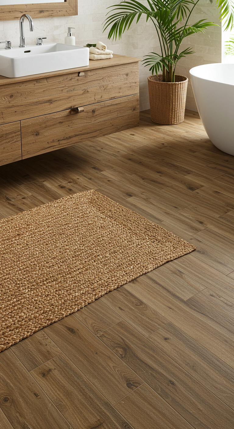 Le revêtement de sol imitation bois flotté évoque les plages tropicales tout en offrant la praticité nécessaire à une salle de bain. Complétez avec des tapis en jute tissé pour apporter texture et confort sous les pieds. Cette combinaison crée une base naturelle parfaite pour votre décor tropical.