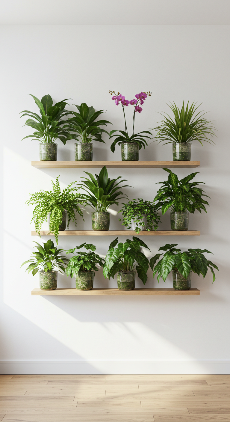 Utilisez des étagères en bois naturel ou bambou pour maintenir l’esthétique organique. Mélangez plantes tombantes et dressées pour un effet visuel riche. Cette solution décorative purifie l’air tout en créant un point focal naturel saisissant.