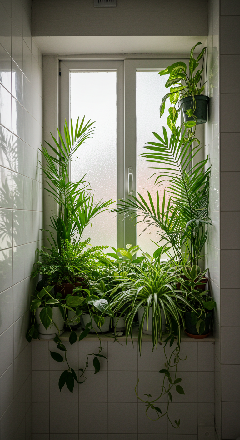 Cette approche purifie naturellement l’air tout en créant une ambiance zen. Variez les hauteurs et les tailles des plantes pour un effet visuel dynamique. L’humidité naturelle de la salle de bain favorise la croissance de ces beautés tropicales, créant un écosystème harmonieux.