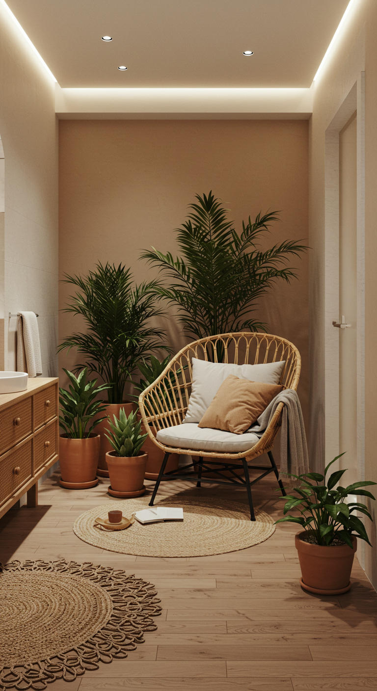 Positionnez ce coin près d’une source de lumière naturelle et entourez-le de plantes tropicales pour une immersion complète. Cette touche finale transforme une salle de bain fonctionnelle en sanctuaire de bien-être inspiré des plus beaux resorts tropicaux.