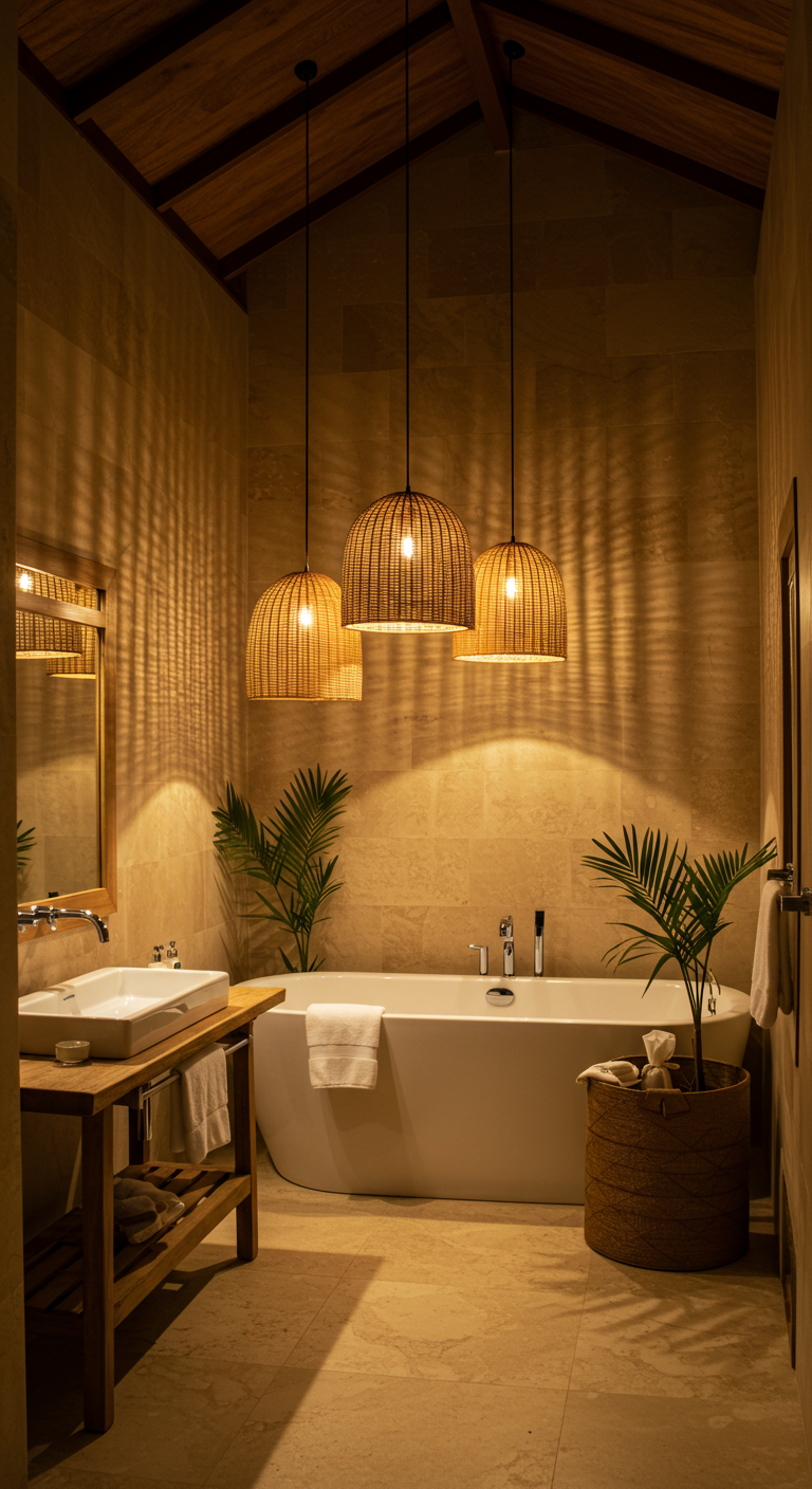 Variez les tailles et suspendez-les à différentes hauteurs pour créer un ensemble rythmé. Cette approche éclaire fonctionnellement tout en participant à l’ambiance tropicale. Le jeu d’ombres créé renforce l’impression d’être dans une cabane de luxe en pleine nature.
