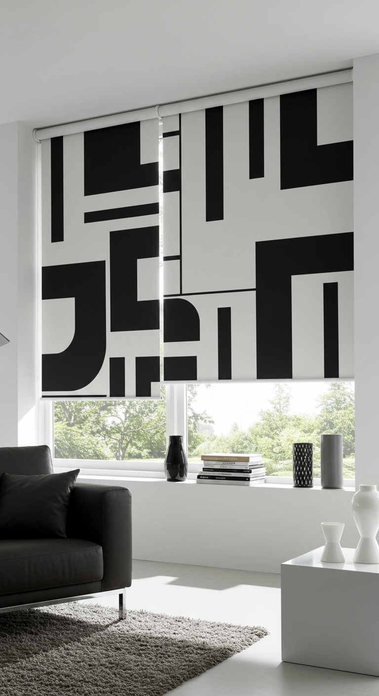 Les stores enrouleurs ornés de graphismes géométriques contemporains allient fonctionnalité et esthétique moderne. Ces habillages de fenêtres offrent un contrôle précis de la lumière tout en servant de toile artistique verticale. Les motifs abstraits en noir sur fond blanc créent un impact visuel fort sans compromettre la luminosité de la pièce.
