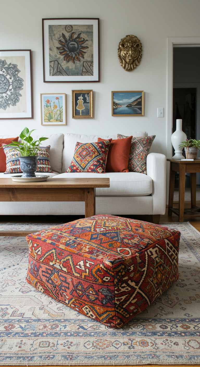 Ces pièces polyvalentes servent à la fois de sièges d’appoint, de repose-pieds ou de tables basses improvisées. La texture du tissage kilim ajoute une dimension tactile intéressante qui contraste agréablement avec des surfaces lisses comme le cuir ou le velours. Parfaits dans un intérieur éclectique ou bohème chic, ils s’intègrent également surprenamment bien dans des décors plus minimalistes où ils deviennent des pièces statement audacieuses.