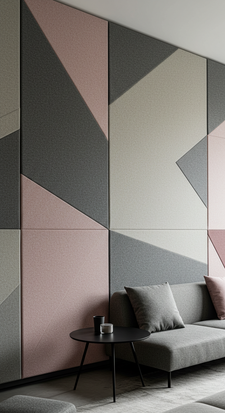 Les panneaux muraux en textile géométrique constituent une alternative sophistiquée à la peinture ou au papier peint traditionnel. Ces installations artistiques combinent fonction acoustique et esthétique contemporaine. Les motifs abstraits dans des tons sourds – gris, beige et rose poudré – créent une ambiance apaisante tout en ajoutant de la texture et de la profondeur aux murs.