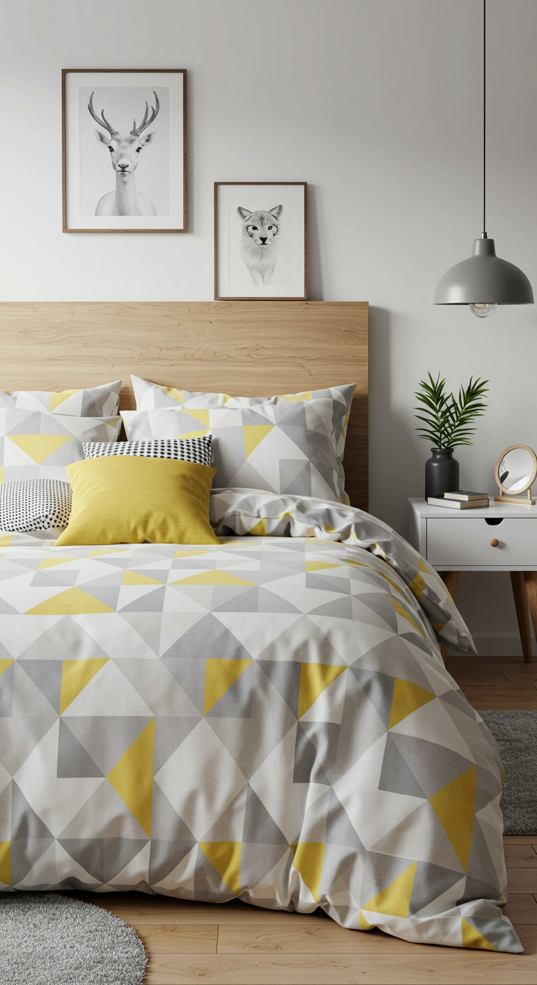 Un ensemble de linge de lit coordonné avec des motifs triangulaires scandinaves transforme votre chambre en un sanctuaire de style nordique. La palette gris, blanc et jaune moutarde évoque la fraîcheur et la modernité propres au design scandinave. Les triangles, disposés en patterns variés, créent un rythme visuel dynamique qui éveille l’espace tout en maintenant une atmosphère sereine.