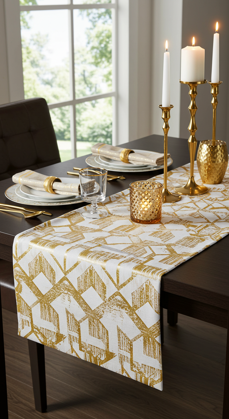 Les chemins de table aux motifs géométriques métallisés ajoutent une touche de glamour contemporain à votre art de recevoir. Les impressions dorées ou argentées sur fond blanc ou coloré captent la lumière et créent un effet sophistiqué parfait pour les occasions spéciales comme pour élever le quotidien. Ces textiles précieux transforment une table ordinaire en une mise en scène digne d’un magazine de décoration.