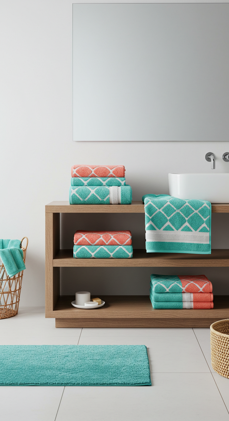 Transformez votre salle de bain en un espace spa moderne avec une collection de serviettes aux motifs géométriques colorés. Les combinaisons de turquoise, corail et blanc évoquent une fraîcheur méditerranéenne tout en maintenant une esthétique contemporaine. Ces serviettes deviennent des éléments décoratifs à part entière lorsqu’elles sont soigneusement pliées et exposées sur des étagères ouvertes ou dans des paniers.