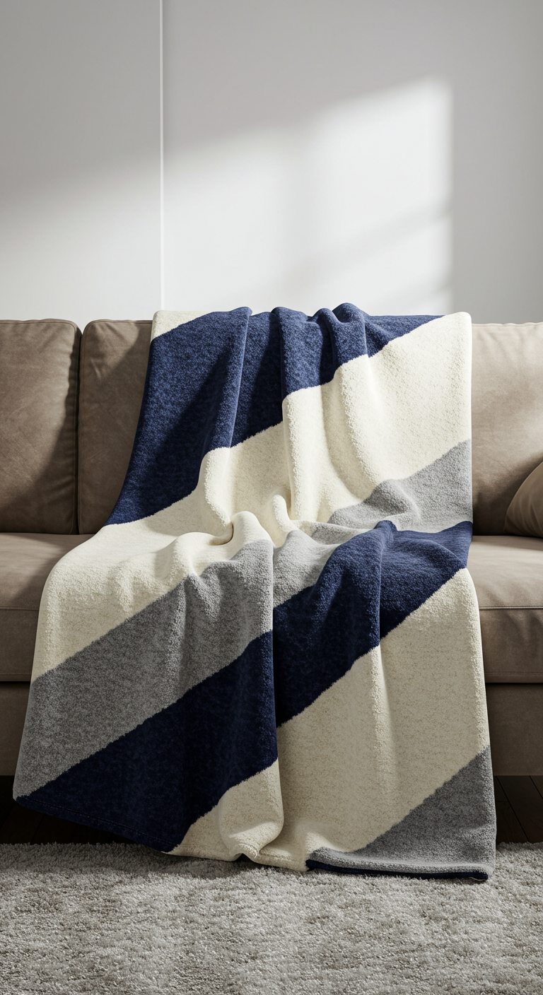 Un jeté de canapé surdimensionné avec des rayures diagonales audacieuses devient instantanément le point focal de votre salon. Les rayures diagonales créent un mouvement dynamique qui guide l’œil à travers l’espace et ajoute de l’énergie visuelle. La combinaison bleu marine, crème et gris offre une sophistication intemporelle qui s’harmonise avec la plupart des palettes de couleurs.