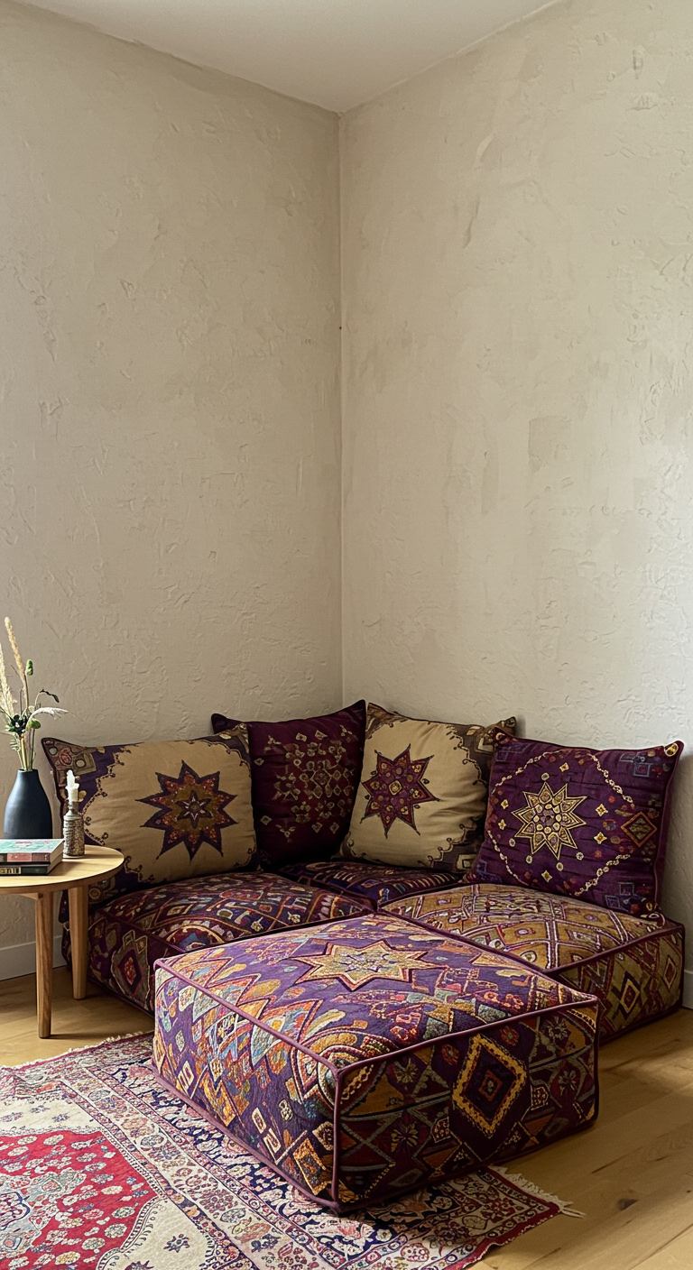 Les coussins de sol marocains ornés de motifs étoilés géométriques créent des espaces de détente informels et invitants. Ces pièces volumineuses aux patterns complexes combinent tradition artisanale et esthétique bohème moderne. Les couleurs riches comme le violet profond, l’or et la crème évoquent le luxe et le confort des intérieurs orientaux réinterprétés pour notre époque.