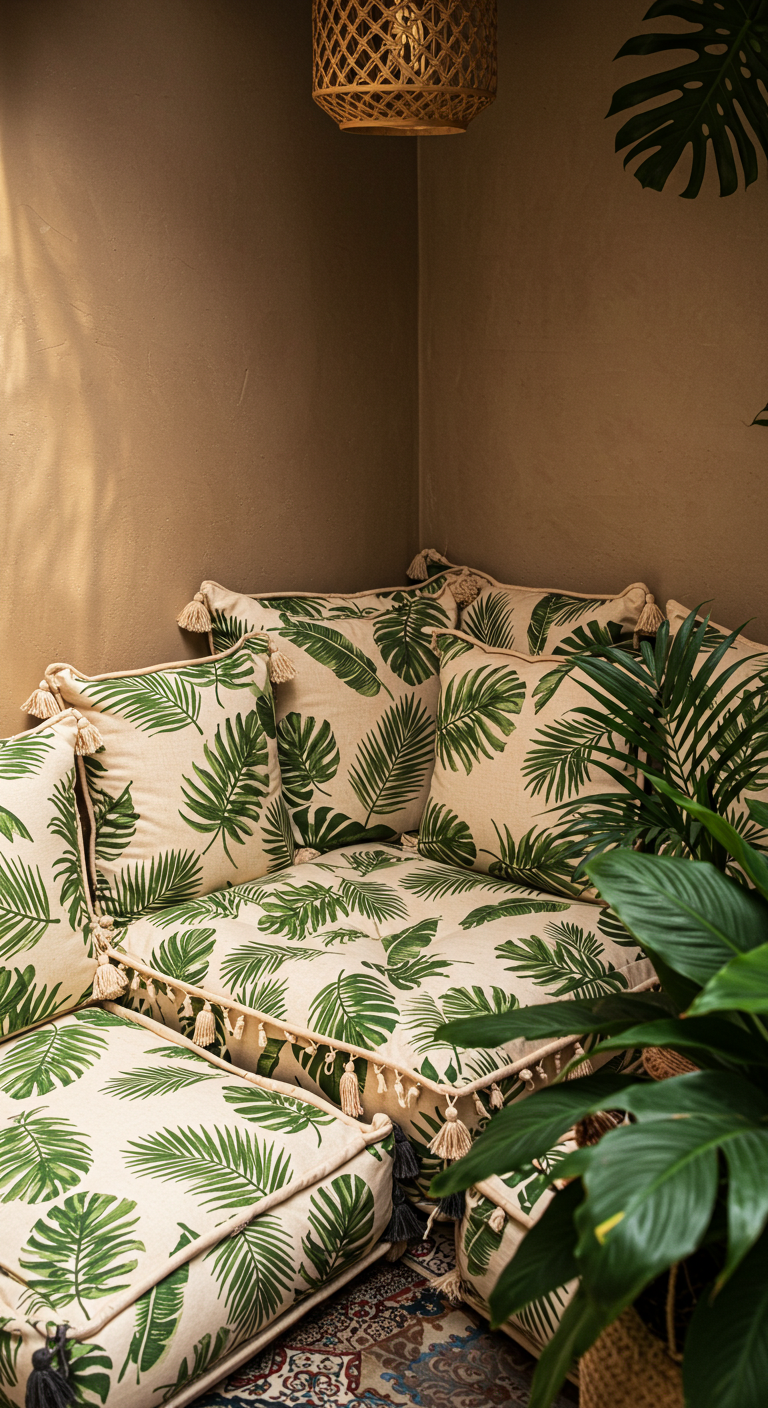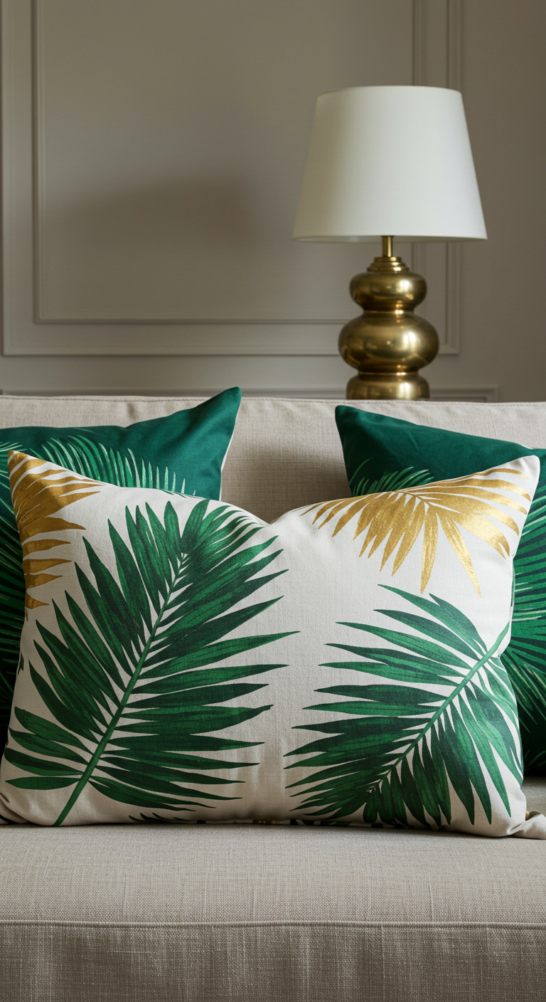 Pour un effet maximal, disposez 3 à 5 coussins sur votre canapé en alternant les motifs de palmiers avec des unis coordonnés. Cette astuce déco peu coûteuse transformera instantanément votre salon en havre tropical sans travaux ni gros investissement.