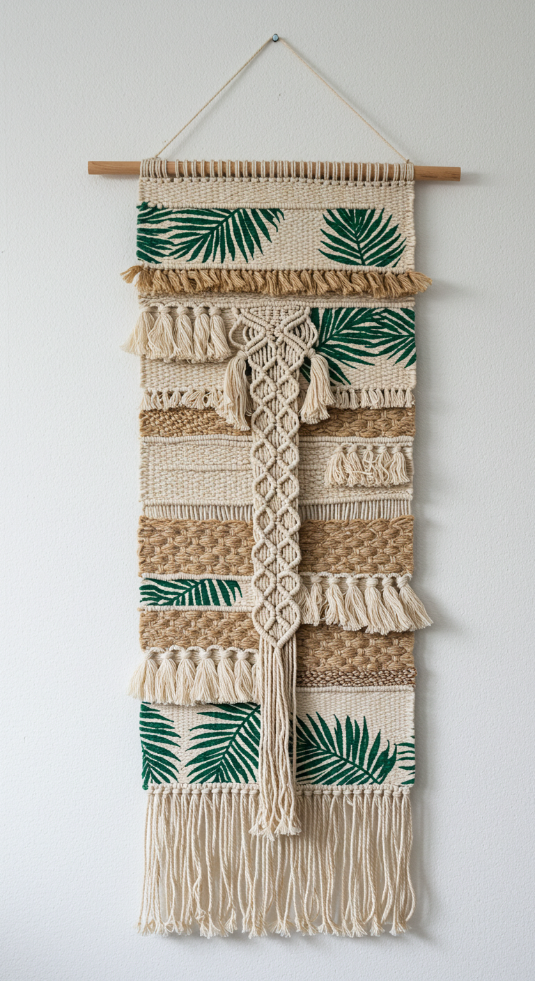 Ces œuvres textiles sont particulièrement efficaces au-dessus d’un lit, d’un canapé ou dans un coin lecture pour créer un point focal artistique. Recherchez des pièces qui mélangent l’impression sur tissu (pour les palmiers) avec des éléments tissés ou noués à la main (macramé, franges, pompons) pour une richesse visuelle et tactile. Les matériaux naturels comme le coton, le lin et le jute renforcent l’aspect organique et authentique.