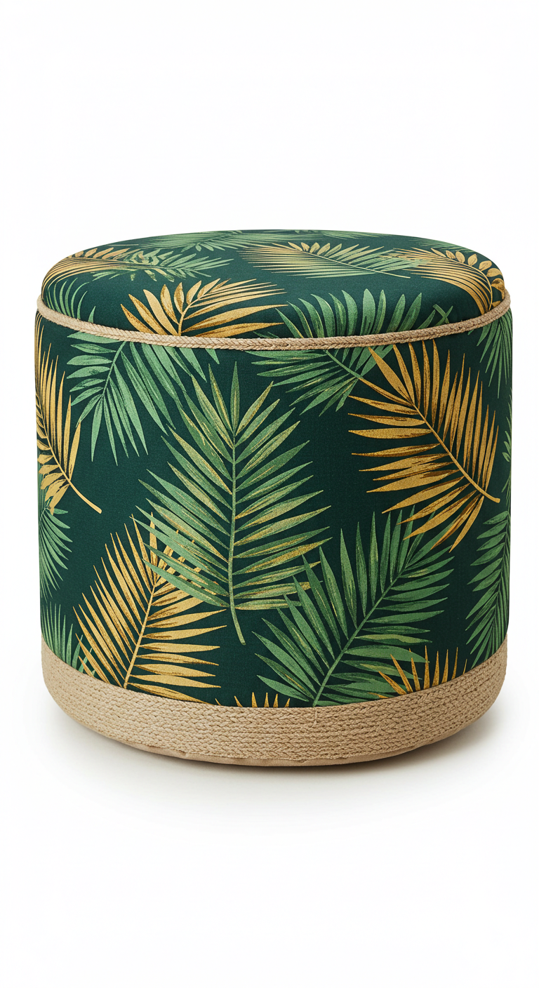 Choisissez des poufs rembourrés fermes, recouverts de tissus résistants comme le jacquard, le velours côtelé ou le canvas épais imprimé de palmiers. Les formes rondes ou carrées s’intègrent facilement dans différents espaces. Pour un look bohème-chic, optez pour des poufs avec des détails comme des passepoils contrastants, des glands décoratifs ou des finitions en corde de jute.