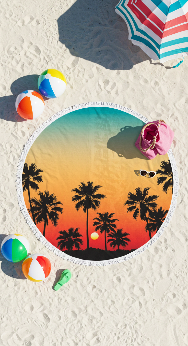 Les formats XXL (ronds de 150 cm de diamètre ou rectangulaires de 100×180 cm) offrent beaucoup plus de possibilités que les serviettes standards. Recherchez des tissus en microfibre ultra-absorbante ou en coton éponge turc de qualité qui sèchent rapidement et restent doux même après de nombreux lavages. Les impressions peuvent être photographiques (vrais palmiers au coucher du soleil) ou illustratives (designs graphiques colorés).