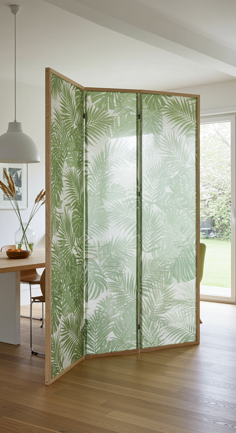 Ces séparateurs se composent généralement d’une structure en bois (bambou, rotin ou bois peint) sur laquelle sont tendus des panneaux de tissu imprimé. Choisissez des tissus semi-transparents comme le lin fin ou le coton voile pour les zones nécessitant de la lumière, ou des tissus plus opaques pour une vraie intimité. Les modèles pliables (paravent accordéon à 3-4 panneaux) offrent flexibilité et mobilité.