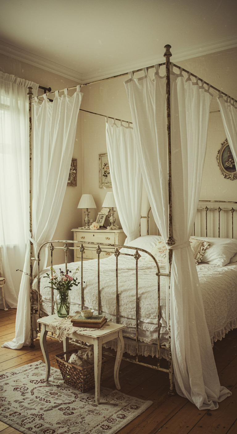 Le lit à baldaquin représente l’essence même du romantisme vintage. Un modèle en fer forgé patiné apporte instantanément du caractère à votre chambre. Choisissez une structure aux courbes délicates, idéalement dans des tons blanc cassé ou gris poudré.
