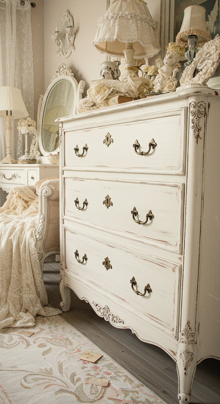 Une commode ancienne patinée constitue un élément central de la déco romantique vintage. Recherchez des pièces aux lignes courbes avec des poignées en bronze ou en porcelaine.