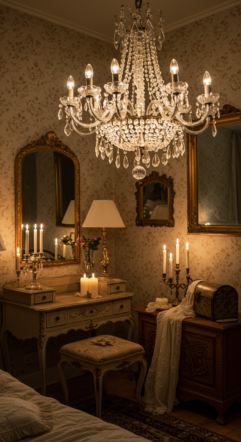 L’éclairage joue un rôle crucial dans l’ambiance romantique. Combinez un lustre en cristal comme source principale avec de multiples bougies pour créer une atmosphère magique.
