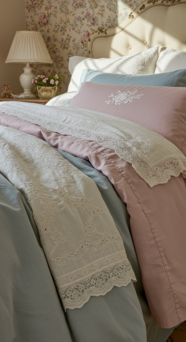 Les textiles constituent l’âme d’une chambre romantique vintage. Superposez coussins brodés, jetés en dentelle et draps en lin pour créer un cocon douillet.