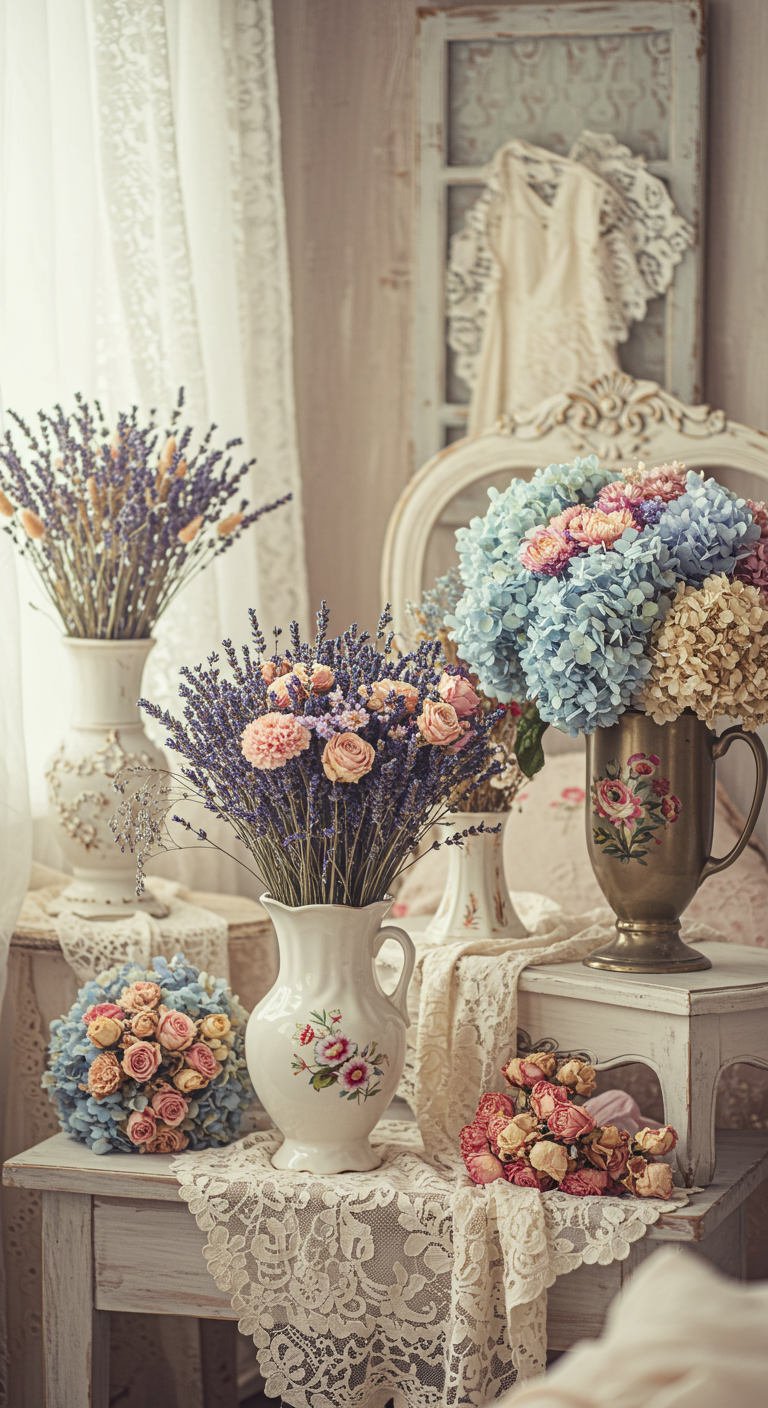 Disposez ces arrangements dans des vases en porcelaine ancienne ou des pots en terre cuite patinée pour renforcer l’authenticité vintage.