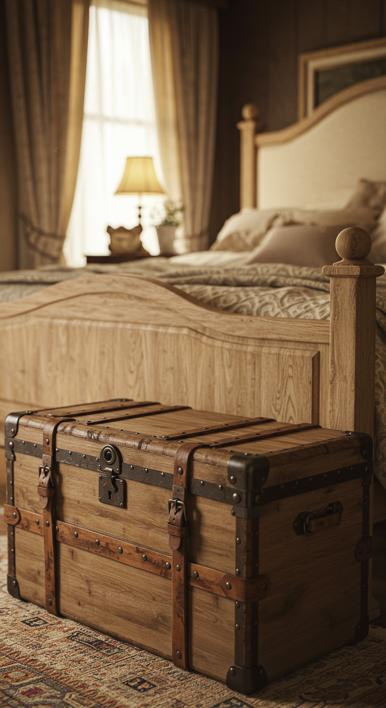 Une malle ancienne en pied de lit combine fonctionnalité et esthétique vintage. Elle offre un rangement supplémentaire tout en servant de table d’appoint décorative.