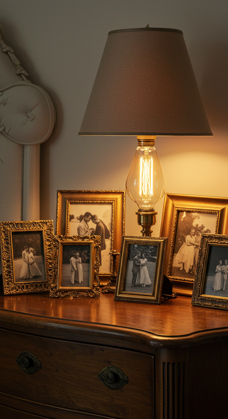 Une collection de cadres photo vintage dorés personnalise votre décoration tout en maintenant l’esthétique d’époque. Variez les tailles et les styles pour créer un ensemble harmonieux.