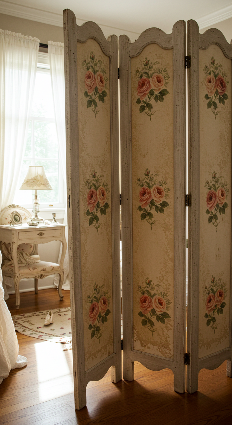 Un paravent fleuri vintage structure l’espace tout en ajoutant une dimension décorative importante. Il peut délimiter un coin dressing ou simplement servir d’élément décoratif.