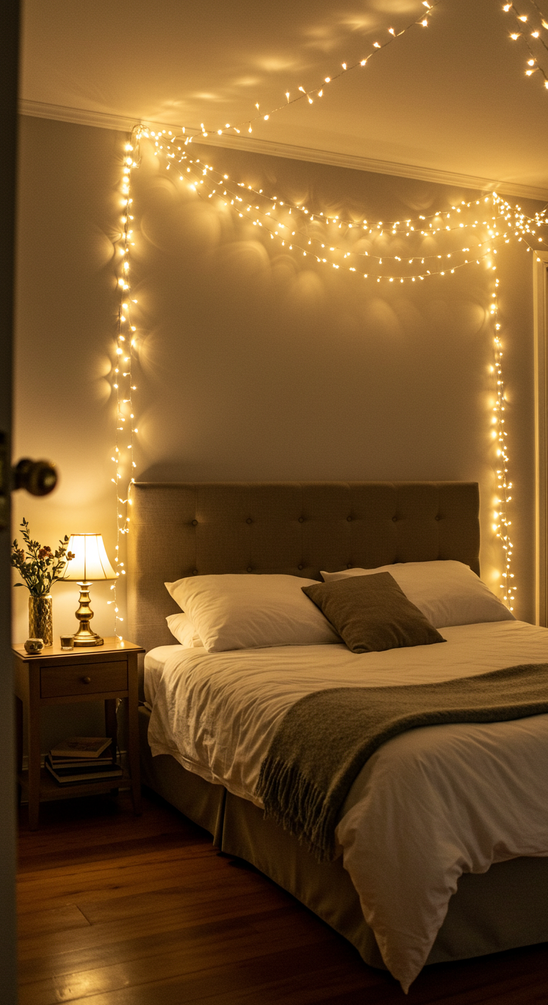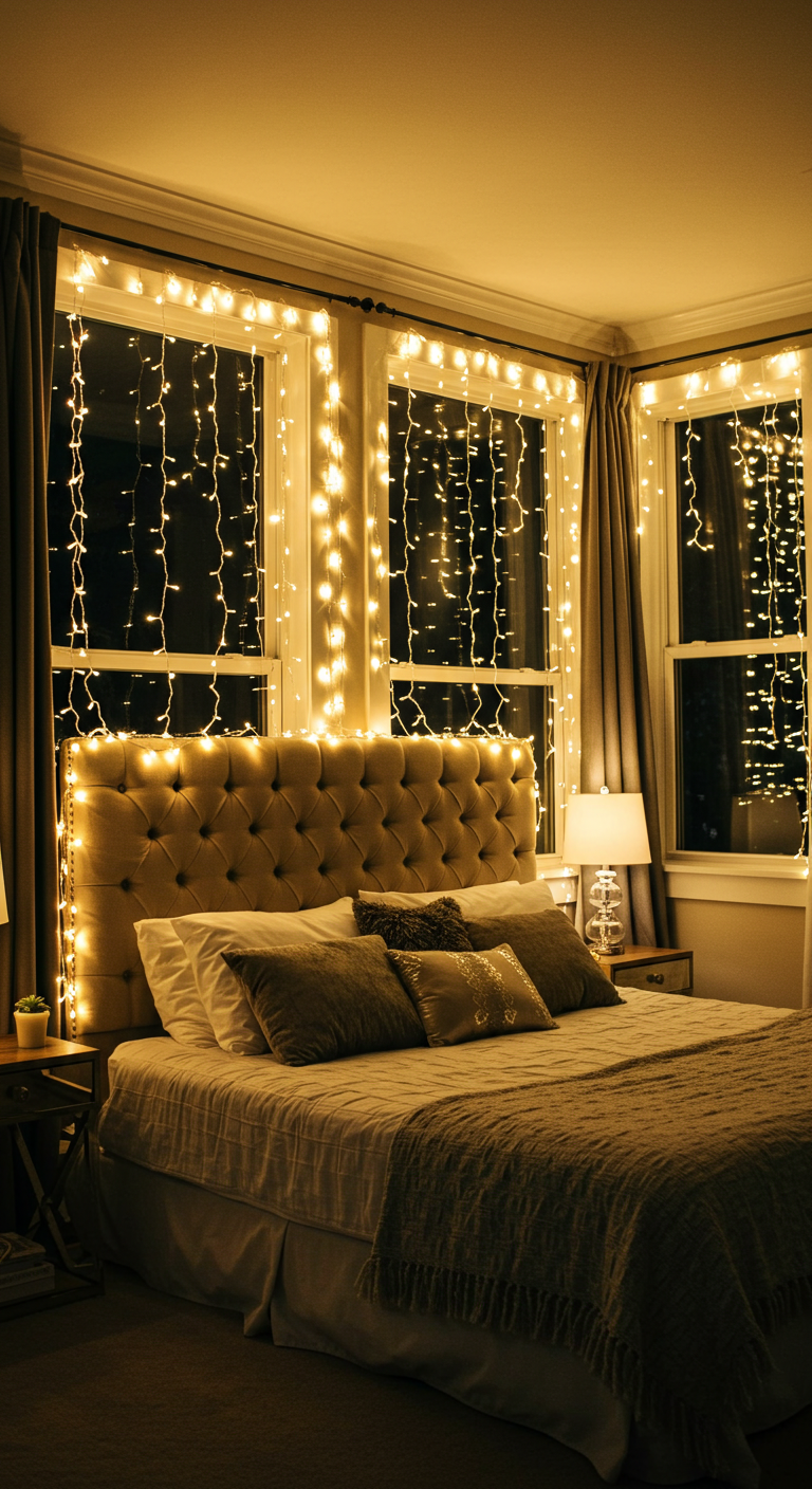 Créez un ciel étoilé au-dessus de votre lit en suspendant des guirlandes lumineuses au plafond. Fixez des crochets discrets et tendez les guirlandes en éventail ou en toile d’araignée pour un effet baldaquin lumineux. Cette installation féerique transforme votre chambre en cocon magique et crée une ambiance digne des plus beaux contes de fées.